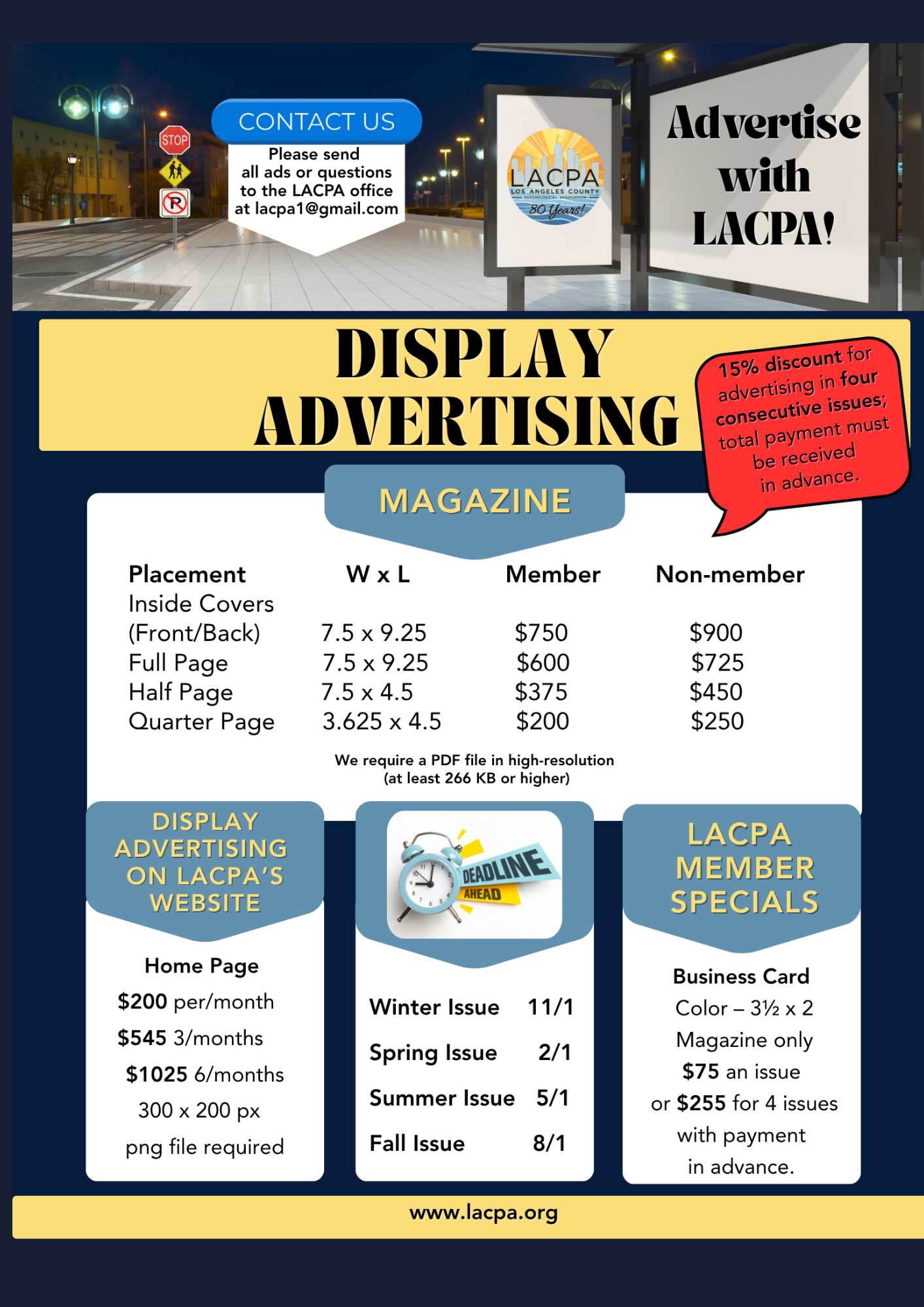 The main focus of this The Los Angeles Psychologist issue is on advocacy efforts for the future of mental health services and professionals. Advocacy lies at the heart of LACPA’s mission as a guild for our profession–to provide professional support, community, and education for the people of Los Angeles County. Our visible presence and active efforts in the community are parts of our organization that I hope will expand. I hope we become an even more recognized, clearly welcoming, good citizen of this sprawling and highly diverse county.
