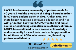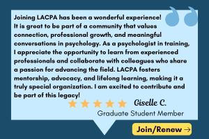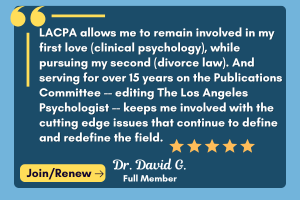 The main focus of this The Los Angeles Psychologist issue is on advocacy efforts for the future of mental health services and professionals. Advocacy lies at the heart of LACPA’s mission as a guild for our profession–to provide professional support, community, and education for the people of Los Angeles County. Our visible presence and active efforts in the community are parts of our organization that I hope will expand. I hope we become an even more recognized, clearly welcoming, good citizen of this sprawling and highly diverse county.