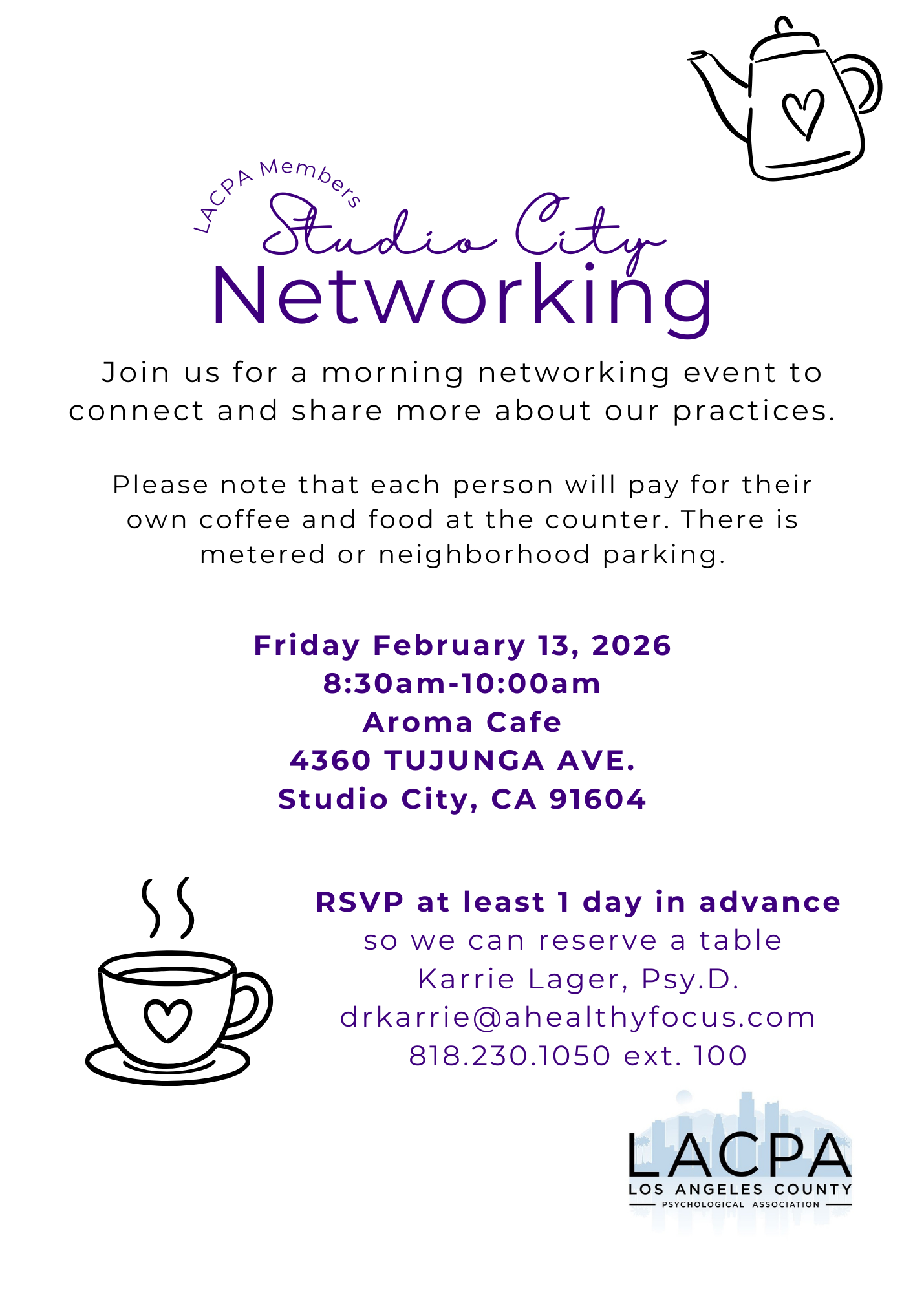 "The opinions of presenters, and their approach to psychological issues and interventions, do not represent a formal endorsement of any position by the Los Angeles County Psychological Association, leadership or its members. The opinions, ideas, and concepts expressed are purely those of the presenter." Contact: Karrie Lager, Psy.D. [email protected] |