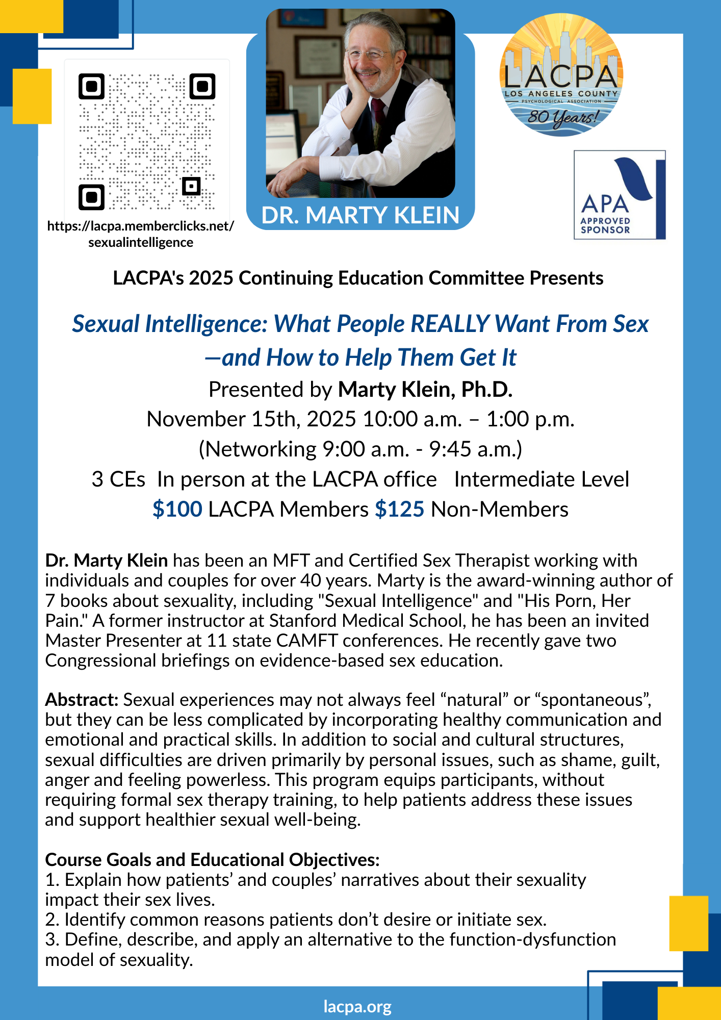 The Los Angeles County Psychological Association (LACPA) is approved by the American Psychological Association to sponsor continuing education for psychologists. LACPA maintains responsibility for this program and its content.